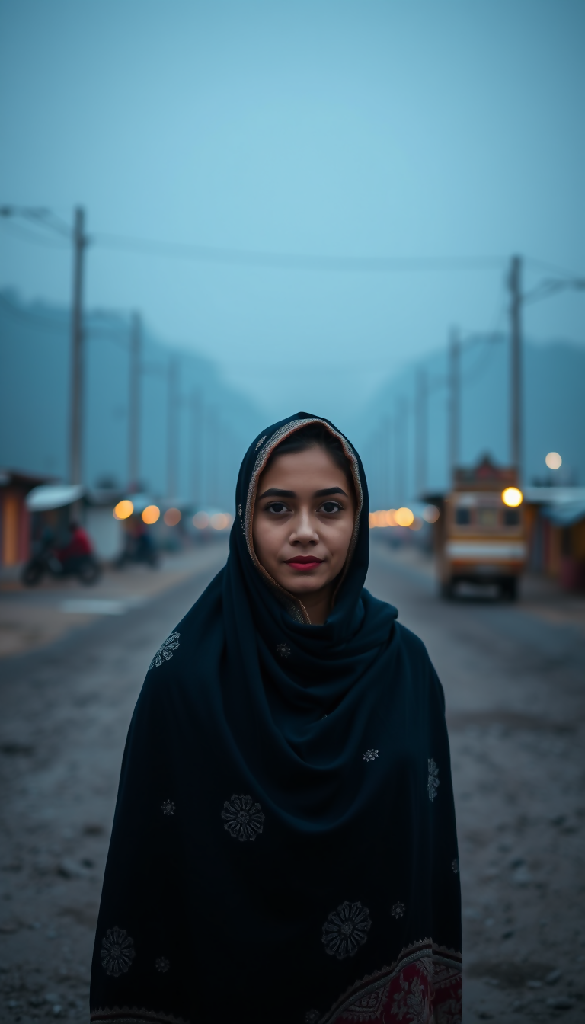A solitary woman walks along a dusty, winding road as dusk settles over the landscape. She is draped in a dark shawl that flows gently with the evening breeze, partially concealing her figure. The fading light casts long shadows on the ground, creating a moody, introspective atmosphere. The dusty road stretches into the horizon, lined with sparse vegetation and faint silhouettes of distant trees. The sky above transitions from soft amber to deep indigo, with streaks of clouds catching the last warm hues of the setting sun. The scene evokes a sense of quiet solitude, reflection, and the subtle beauty of everyday life in twilight.