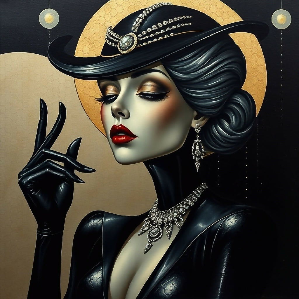 An evocative portrait of a woman that is both mysterious and extravagant. Your face is surrounded by a fascinating aura that immediately attracts attention. The woman's eyes are deep and expressive, and seem to hold secrets just waiting to be discovered. Overall, this portrait conveys the feeling of elegance and intrigue, and invites the viewer to learn more about the history and secrets of this fascinating woman.