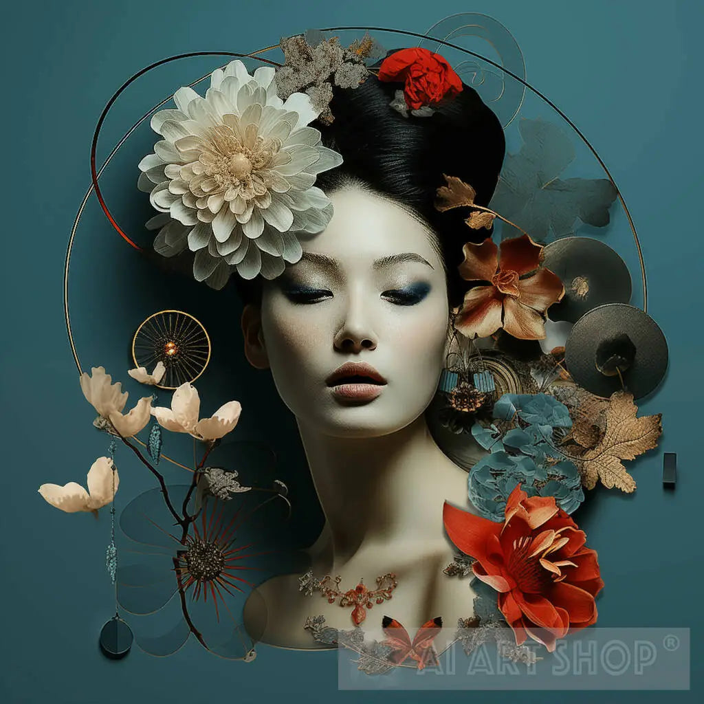 an artistic and surrealistic style. In the image, a photograph of a person is combined with graphic and floral elements to create a visually rich and complex composition.