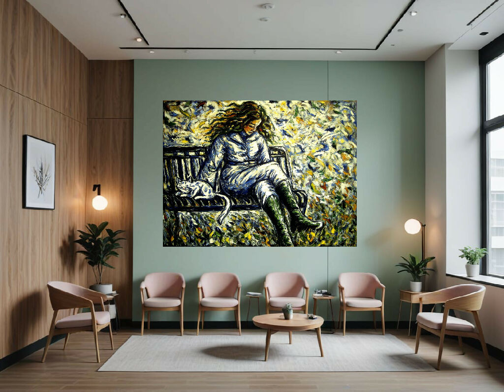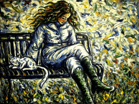 This painting depicts a woman seated comfortably on a park bench, accompanied by a white cat with dark markings curled up beside her. The woman's long, flowing hair appears windswept, blending dynamically with the swirling background. She is dressed in a light, buttoned coat and matching trousers, with tall, green boots crossing at the ankles.