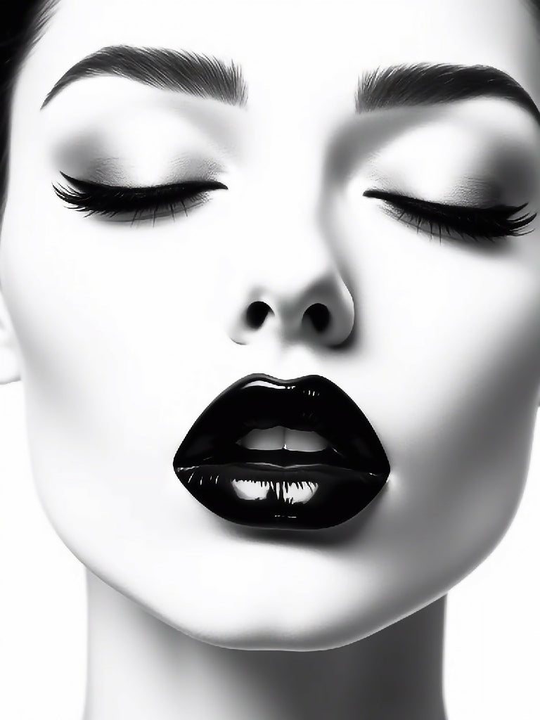 A striking black and white illustration of a woman's portrait showing the face of a woman with her eyes closed. The gentle contours of her face are clear and expressive, with the light and shadow effects accentuating the fine details of her features. Her lips are shaped in a gentle, relaxed smile, which gives a peaceful and thoughtful mood. This depiction in black and white conveys a timeless elegance and invites the viewer to explore the emotions and thoughts behind the closed gaze. It is an image that exudes both beauty and depth, celebrating the power of silence and inner peace.