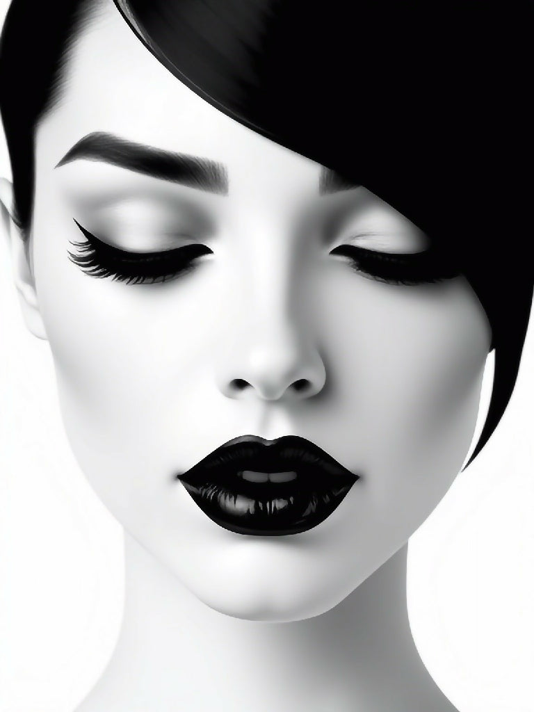 A striking black and white illustration of a woman's portrait showing the face of a woman with her eyes closed. The gentle contours of her face are clear and expressive, with the light and shadow effects accentuating the fine details of her features. Her lips are shaped in a gentle, relaxed smile, which gives a peaceful and thoughtful mood. This depiction in black and white conveys a timeless elegance and invites the viewer to explore the emotions and thoughts behind the closed gaze. It is an image that exudes both beauty and depth, celebrating the power of silence and inner peace.