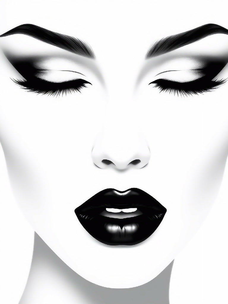A striking black and white illustration of a woman's portrait showing the face of a woman with her eyes closed. The gentle contours of her face are clear and expressive, with the light and shadow effects accentuating the fine details of her features. Her lips are shaped in a gentle, relaxed smile, which gives a peaceful and thoughtful mood. This depiction in black and white conveys a timeless elegance and invites the viewer to explore the emotions and thoughts behind the closed gaze. It is an image that exudes both beauty and depth, celebrating the power of silence and inner peace.