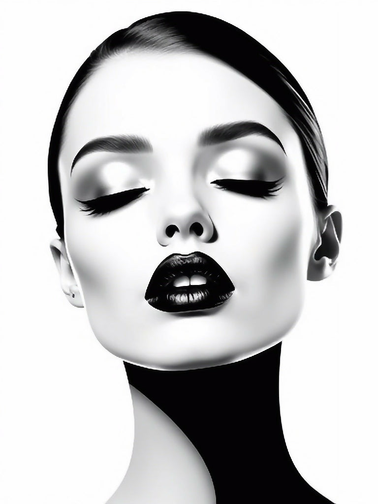 A striking black and white illustration of a woman's portrait showing the face of a woman with her eyes closed. The gentle contours of her face are clear and expressive, with the light and shadow effects accentuating the fine details of her features. Her lips are shaped in a gentle, relaxed smile, which gives a peaceful and thoughtful mood. This depiction in black and white conveys a timeless elegance and invites the viewer to explore the emotions and thoughts behind the closed gaze. It is an image that exudes both beauty and depth, celebrating the power of silence and inner peace.