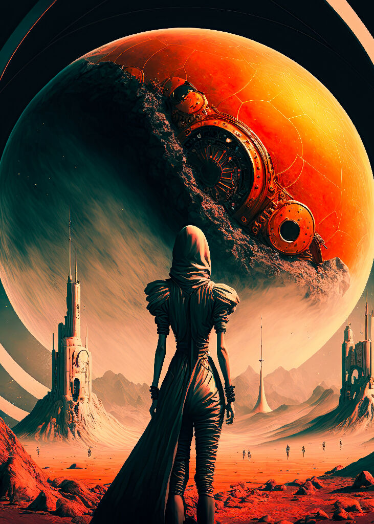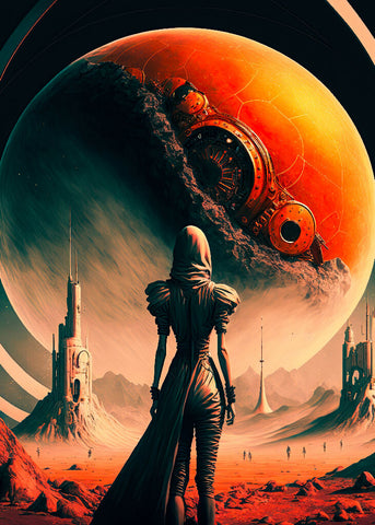 Woman warrior on an alien planet. Futuristic space exploration and travel concept. Digital painting, poster design
