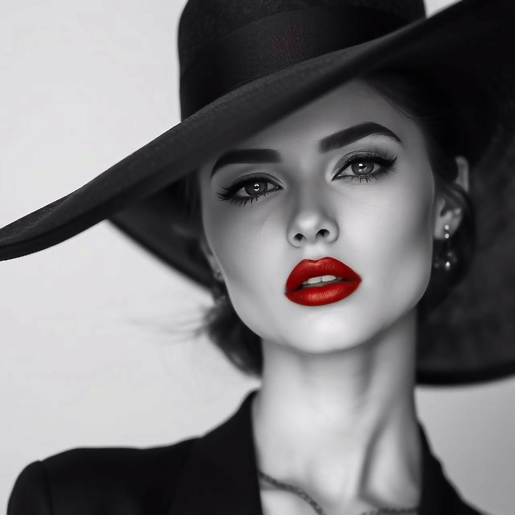 An impressive portrait of a woman wearing a large, elegant hat. The woman has a confident and captivating smile, which is accentuated by her bright red lips. The bold shade of the lips is a real eye-catcher and contrasts beautifully with the hat and her complexion. Her eyes exude a mixture of elegance and strength, and the gaze she casts into the camera captivates the viewer. Overall, this portrait exudes an intriguing blend of elegance, confidence, and style that embodies the timeless appeal of a glamorous woman. It invites the viewer to admire the details and charisma of the protagonist.