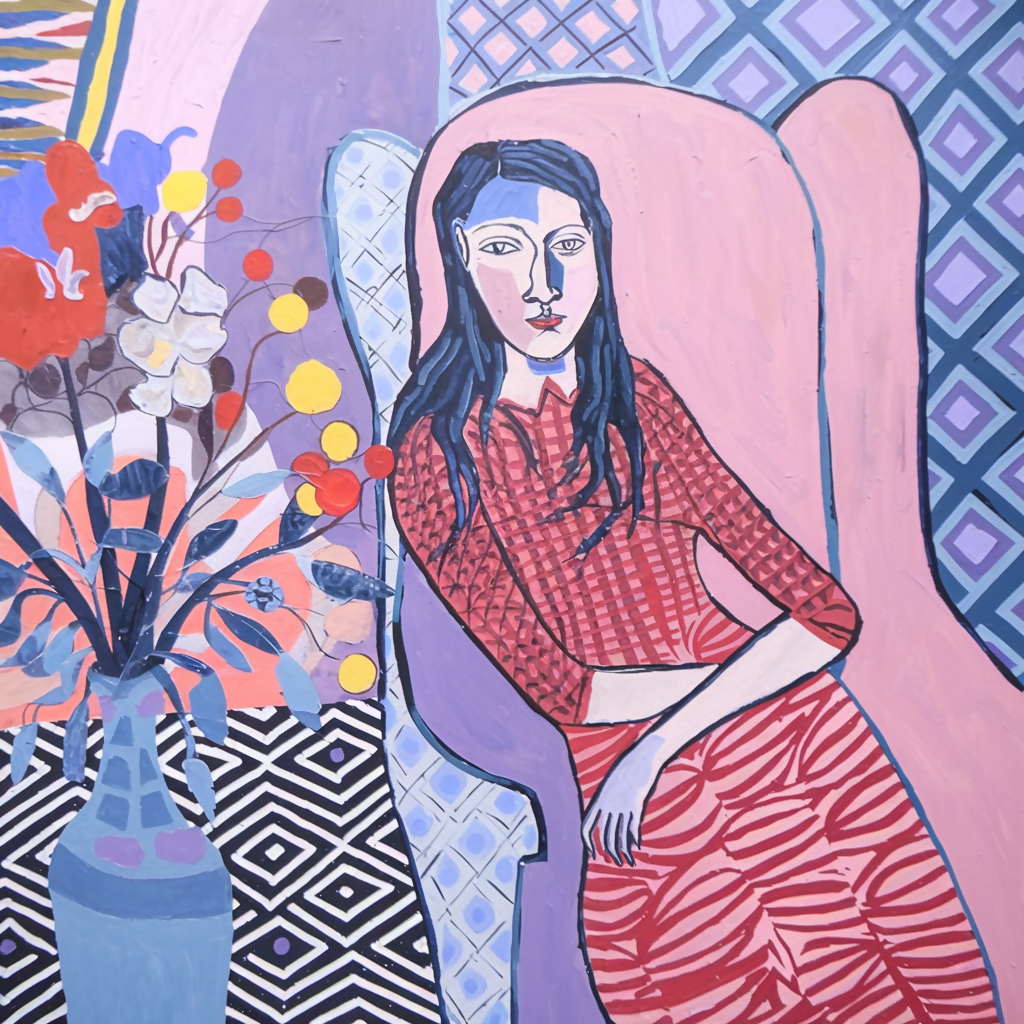 An attractive expressionist Ai produced painting in expressionist style in the traditional genre of portraiture.  The seated woman is surrounded by vibrant, bold colours, with abstract, geometric, and flowing patterns adorning her clothing.  The overall composition is expressive and energetic, with a sense of movement and emotion radiating from the scene. The art style embraces the unpredictability and emotional depth of expressionism, using a vibrant palette of harmonious colours and a loose, painterly technique. The exceptional use of colour creates a dynamic unity. The palette includes warm reds, soft pinks and blues in a cool warm contrast, and mauves and yellow as a complimentary contrast, to stunning effect.