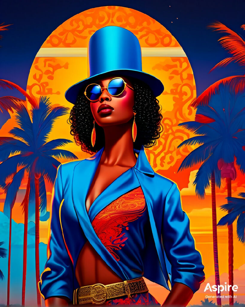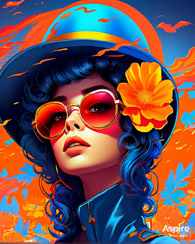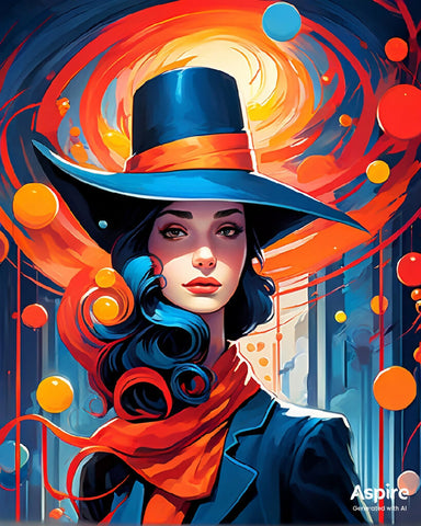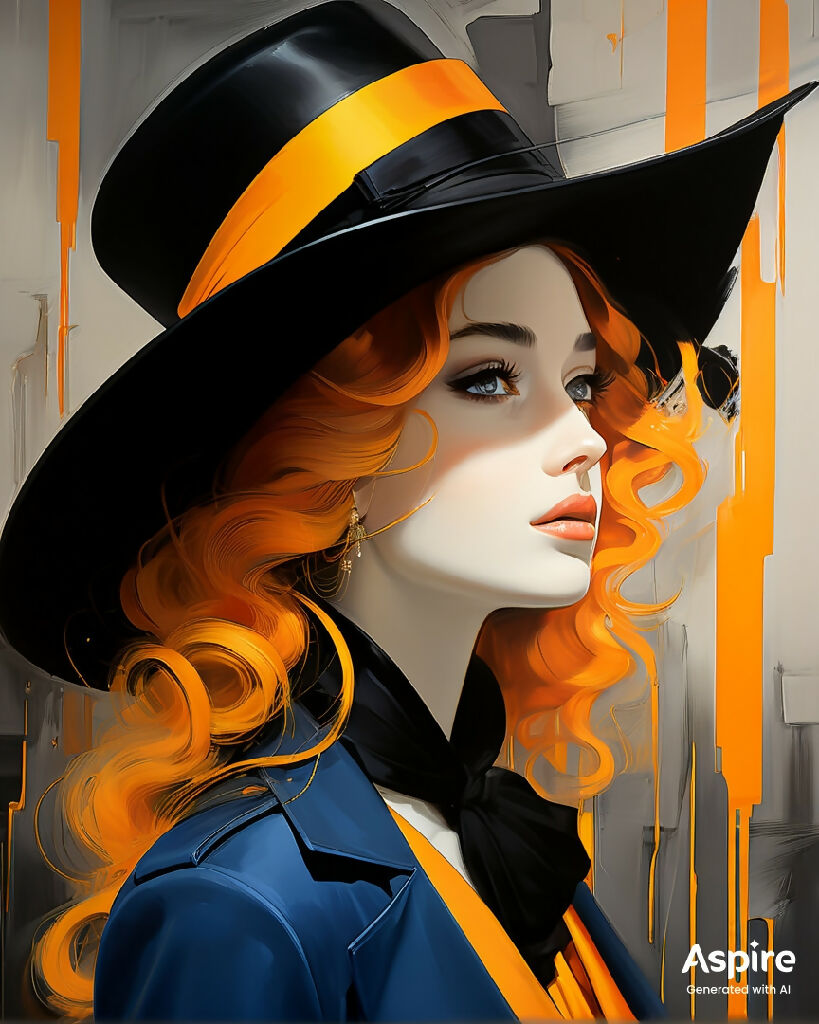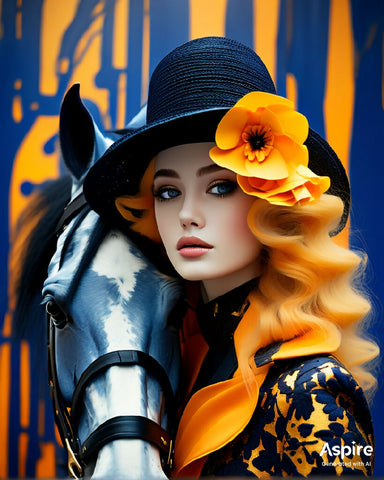 A mesmerizing woman with intense gaze, wearing a black wide-brimmed hat adorned with intricate gold patterns, styled in a chic bob with cascading curls. She stands against a surreal backdrop of stark contrast: a bold orange transitioning to a deep blue, featuring a striking black Arabian horse motif. The rich reds, fiery oranges, and golden yellows play against the dark blues, creating a dreamlike atmosphere. Brushstrokes enhance the vivid and ethereal quality, resembling a captivating lo-fi fantasy photograph.