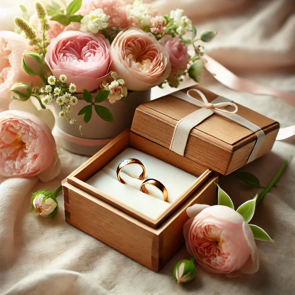A beautifully crafted wooden wedding ring box, opened to reveal two elegant gold rings nestled inside. The box is surrounded by delicate pastel-colored flowers, including roses and peonies, placed on soft linen fabric. Illuminated by gentle natural light, the scene exudes romance and charm, with a softly blurred background enhancing the intimate and timeless atmosphere. Perfect for celebrating the beauty of love and commitment.