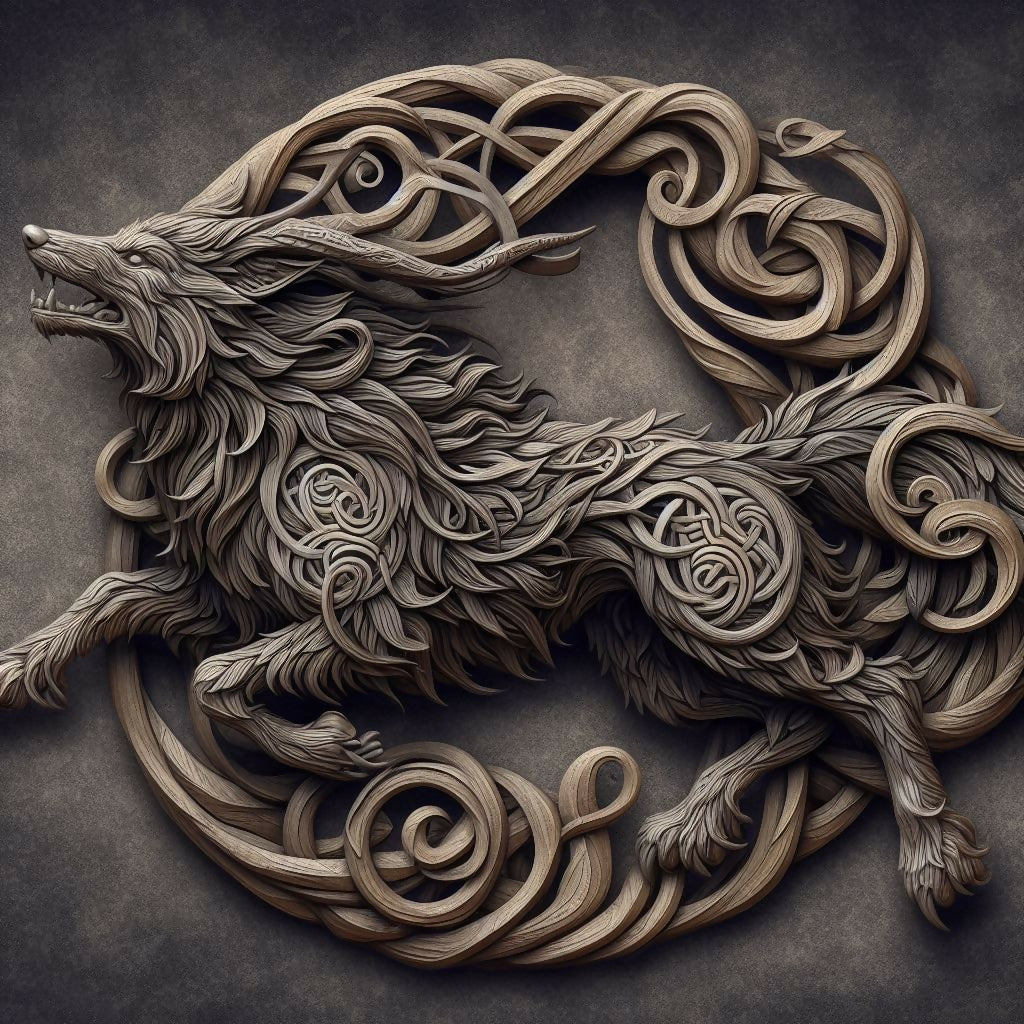 Tags: wolf, wooden sculpture, stylized animal, nature spirit, carved wood, fantasy art, motion, organic design, wild, mystical.