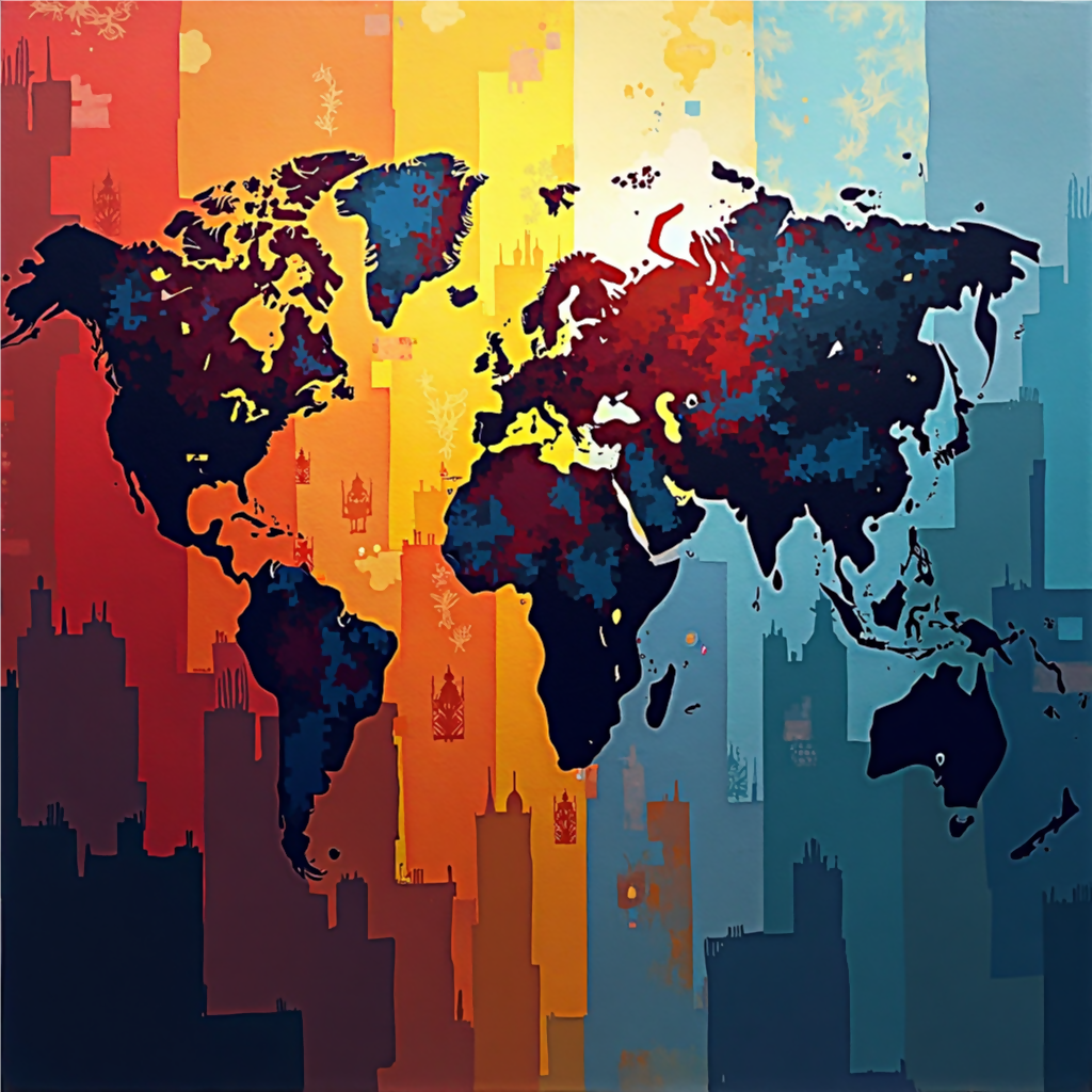 - Geometric abstraction in the broader category of contemporary abstract art—think of it as a digital, color-field collage that uses simplified shapes and bold stripes to reimagine a world map.