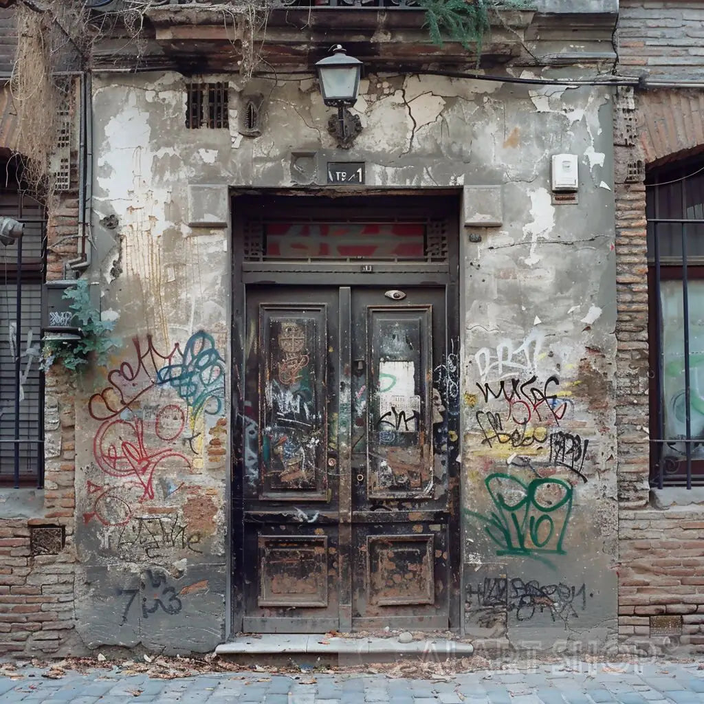 Dilapidated door with a rich patina, framed by cracked and faded walls. The abundance of graffiti and signs of neglect create a contrast between decay and artistic rebellion.