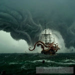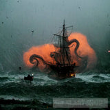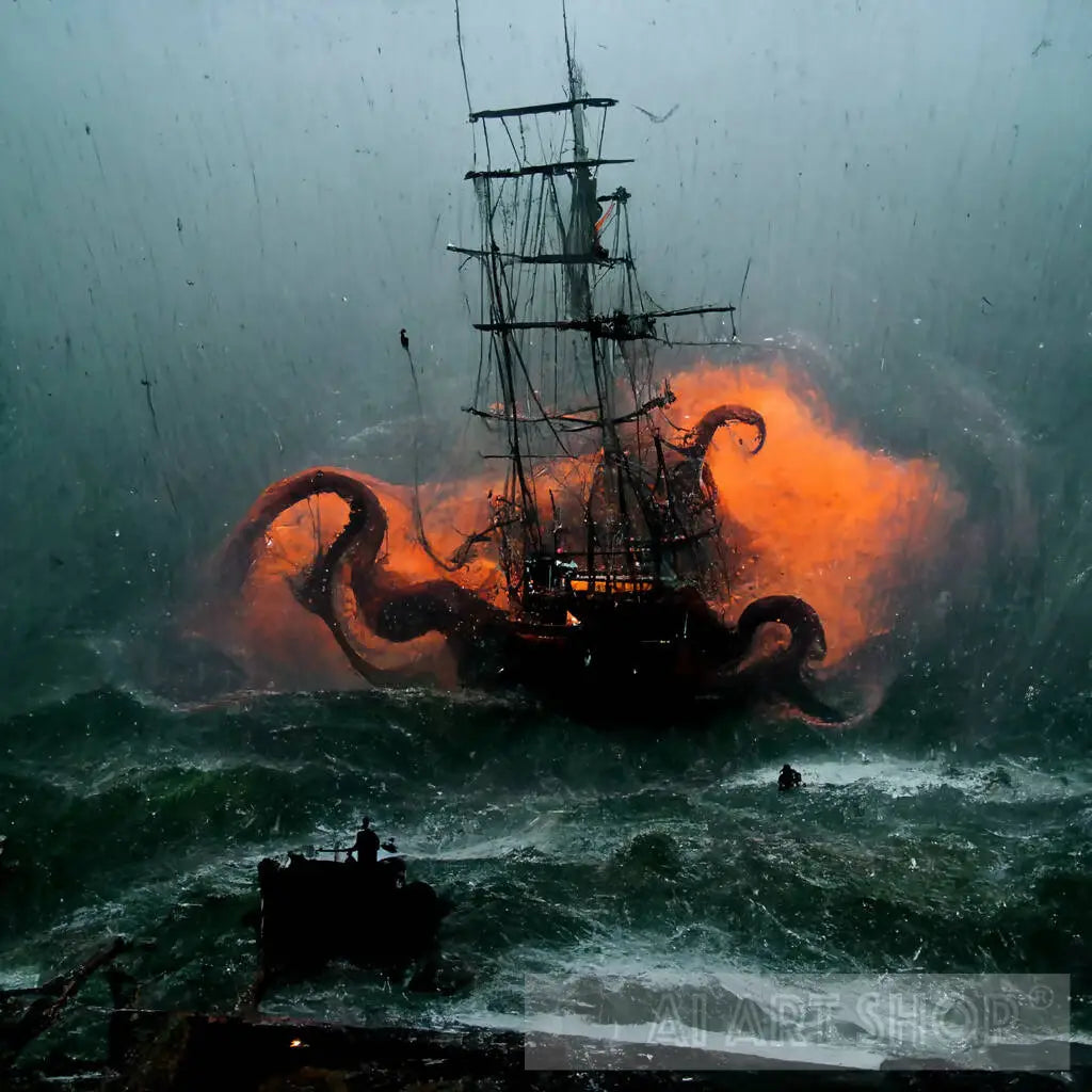 A huge angry Octopus sinks a ship during rough waves in the ocean. This a 1024x1024 digital artwork and is sent digital. This is printable on paper and canvas. Can be used as wall canvas too.