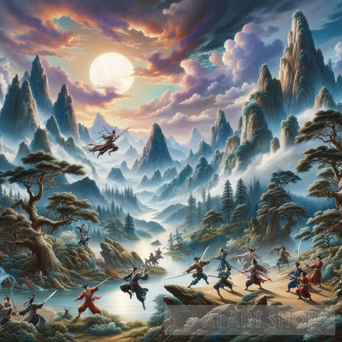 Two secret martial arts societies battle each other in ancient China in the mountains and forest with the moon shining overhead.