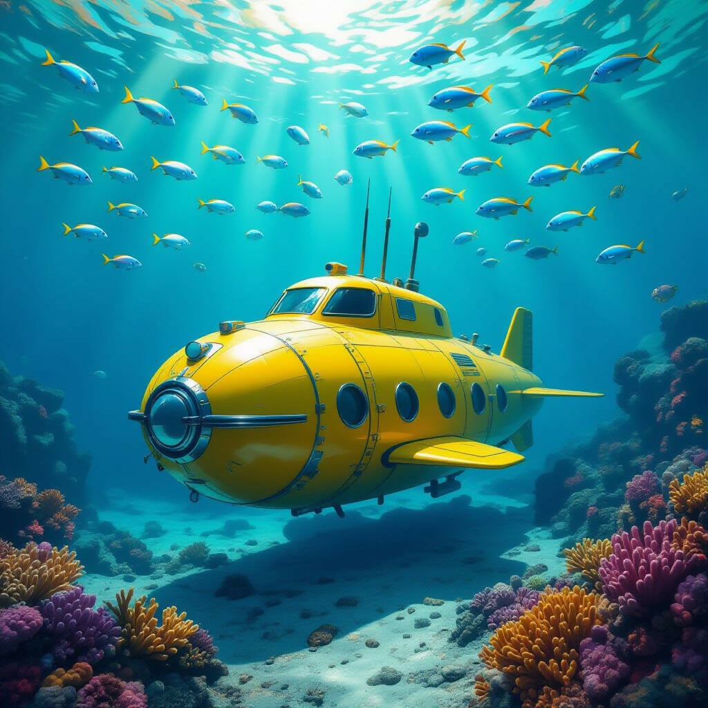 This vibrant underwater image features a bright yellow submarine exploring a colourful coral reef. Surrounded by schools of blue and yellow fish, the scene is illuminated by sunlight streaming through clear water. The submarine’s rounded design and large window add a whimsical, adventurous feel. Rich coral hues—pink, orange, and purple—enhance the sense of wonder and marine biodiversity, evoking themes of exploration and discovery.