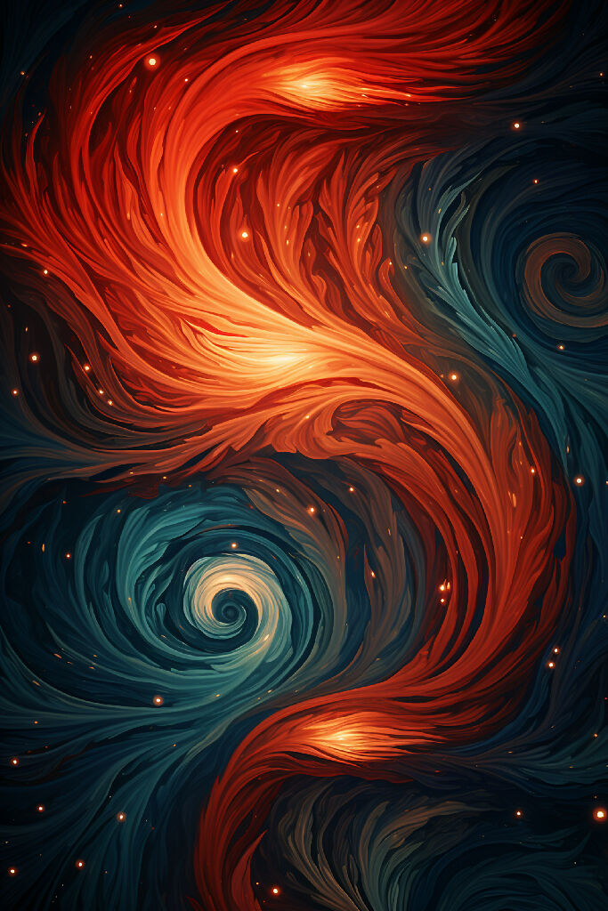 An ethereal composition where feathery brush strokes swirl to form a reimagined yin and yang symbol. The classic circular form emerges not from solid shapes but from wispy, delicate strokes that seem to dance across the canvas. The yang portion radiates in vibrant crimson red tones that blend from deep burgundy at its core to lighter coral at the edges, while the yin half flows with various shades of blue—from deep navy to cerulean at its boundaries. Where the colors meet, their feathery edges intertwine like wisps of smoke, creating a soft gradient rather than a harsh division.
