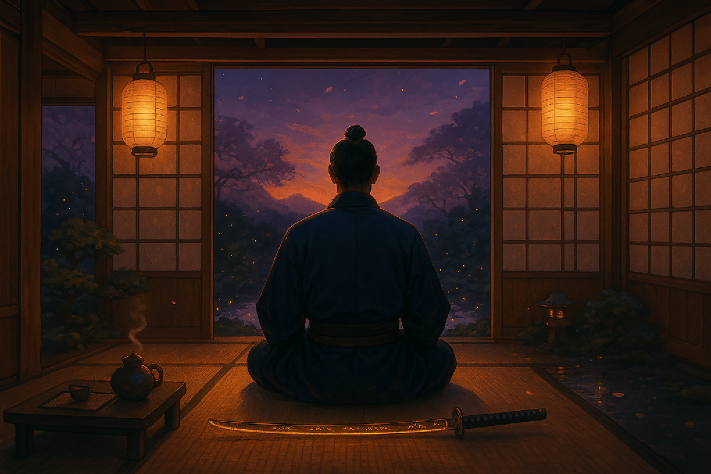 A breathtaking 8K digital painting of a samurai meditating inside a twilight teahouse garden. This artwork blends traditional Japanese aesthetics with modern fantasy illustration, featuring glowing lanterns, drifting cherry blossoms, a serene koi pond, and a mystical katana engraved with runes. Perfect for collectors, wall art, book covers, and premium digital prints.