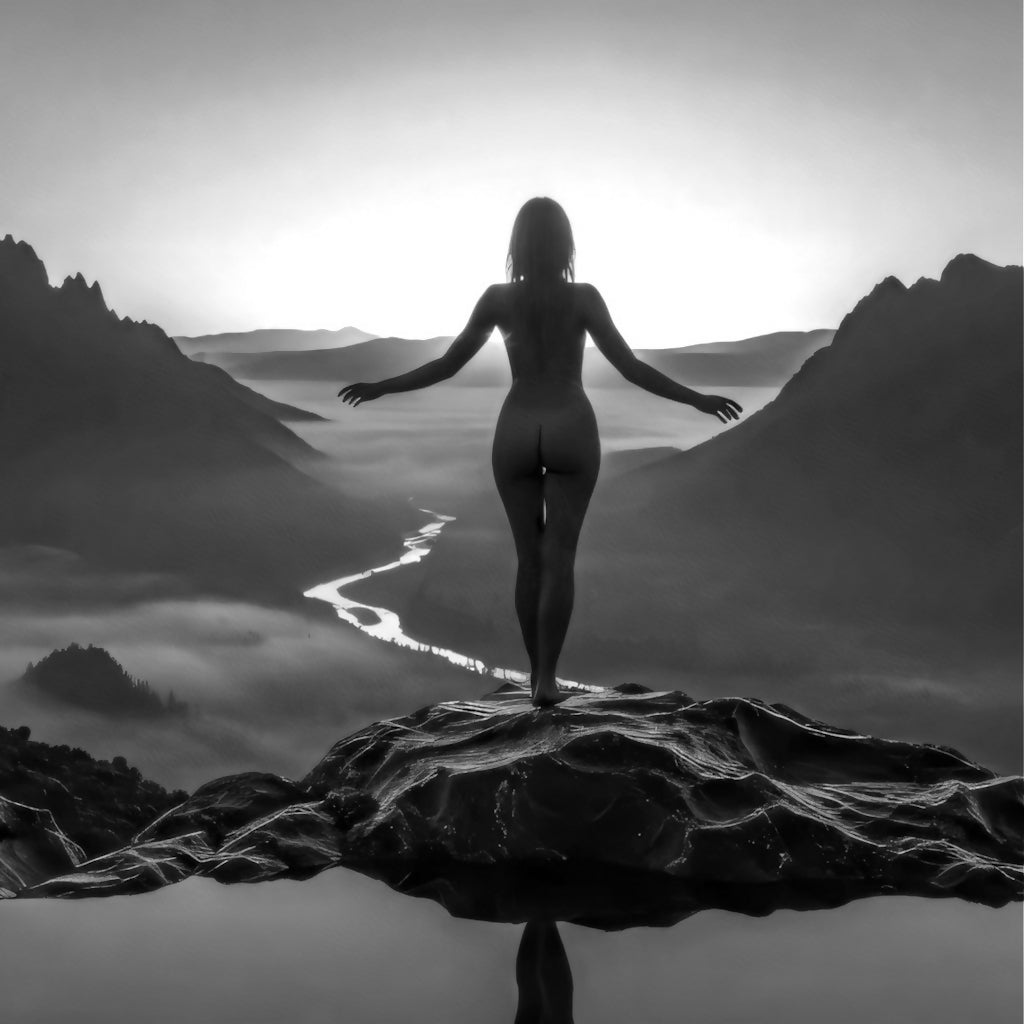 Dramatic black and white photo capturing a woman's silhouette and perfect reflection over a vast, misty river valley from a cliff edge.