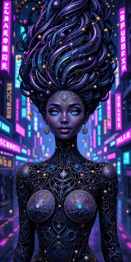 A vibrant and high-contrast Zentangle-inspired hieroglyphic illustration of a smiling shy woman, whose long, fluid hair rises upward in a mesmerizing display of intricate geometric patterns, spirals, points, and lines. Her deep black azabache hair, with silver and metallic highlights, forms a series of entwined shapes like triangles, elegant curves, concentric circles, and repetitive figures, creating a captivating texture that reflects her power and mystery. Her large, deep eyes, the focal point of her face, feature circular patterns in shades of aqua and light violet, surrounded by delicate golden dots and silver lines, giving the impression of a digital glow from her intense gaze. The background is a futuristic city illuminated by neon lights in lilac, turquoise, and pink, with complex layers of bright patterns and digital graffiti, blending seamlessly with the woman's geometrically adorned attire and creating a mysterious, energy-charged atmosphere.