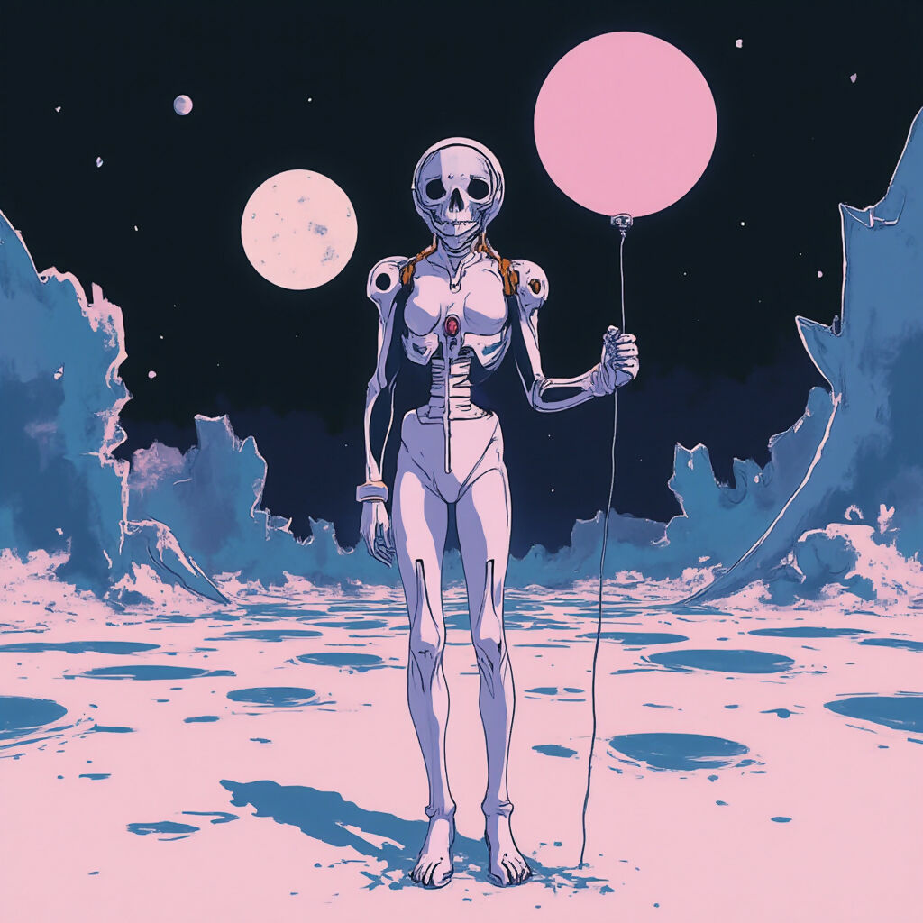 This piece is part of my Skeletons & Aliens series, one of four in the collection. It depicts a skeleton drifting through space, guided by balloons, eventually landing on Mars. The soft pink and peach tones bring a harmonious balance to the artwork and illustration.